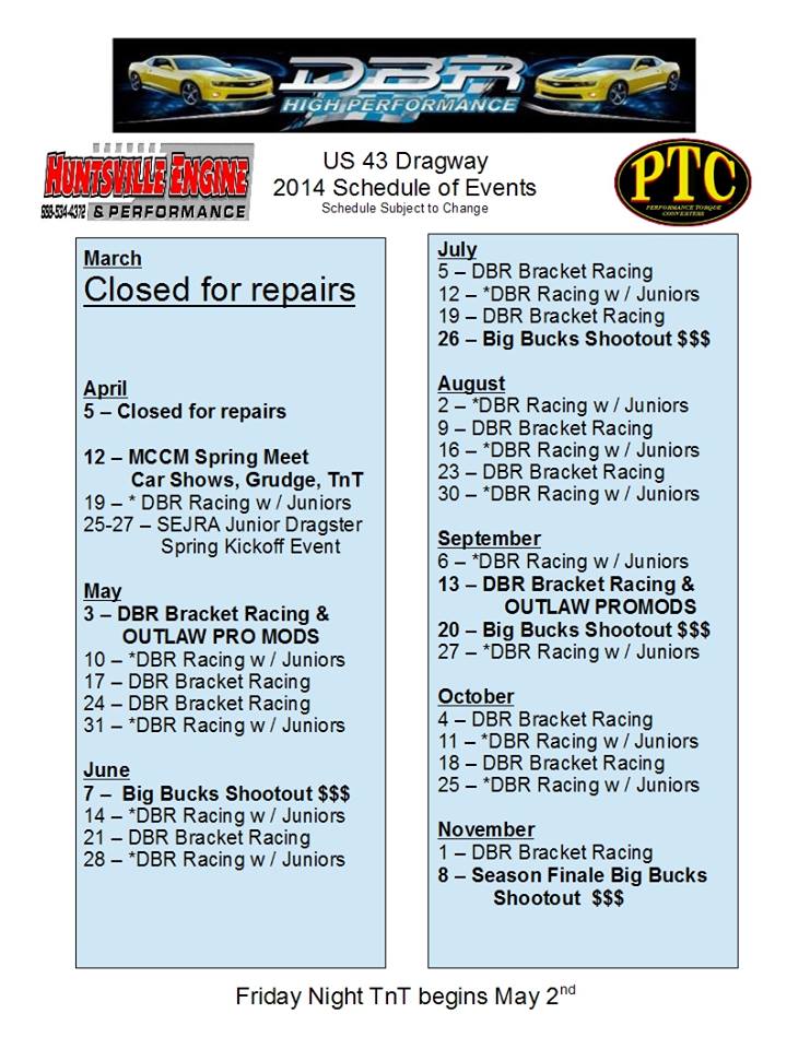 Follow Highway 29 to Highway 121 then head southwest to the track. US 13 Dragway Ready To Kick-Off Exciting 2021 Season. 7152013 Gallatin TN - Big Bucks Bracket Racing hits High Gear for July with five big races this weekendThe Super 7 Series in Alabama the Big Bucks Shootout in Ethridge TN the Summer Superbucks Sunday at Gateway Southern Super Tens returns to Monroe LA and the JEGS Summer Door Car Shootout at I57 Dragway in Benton IL are.